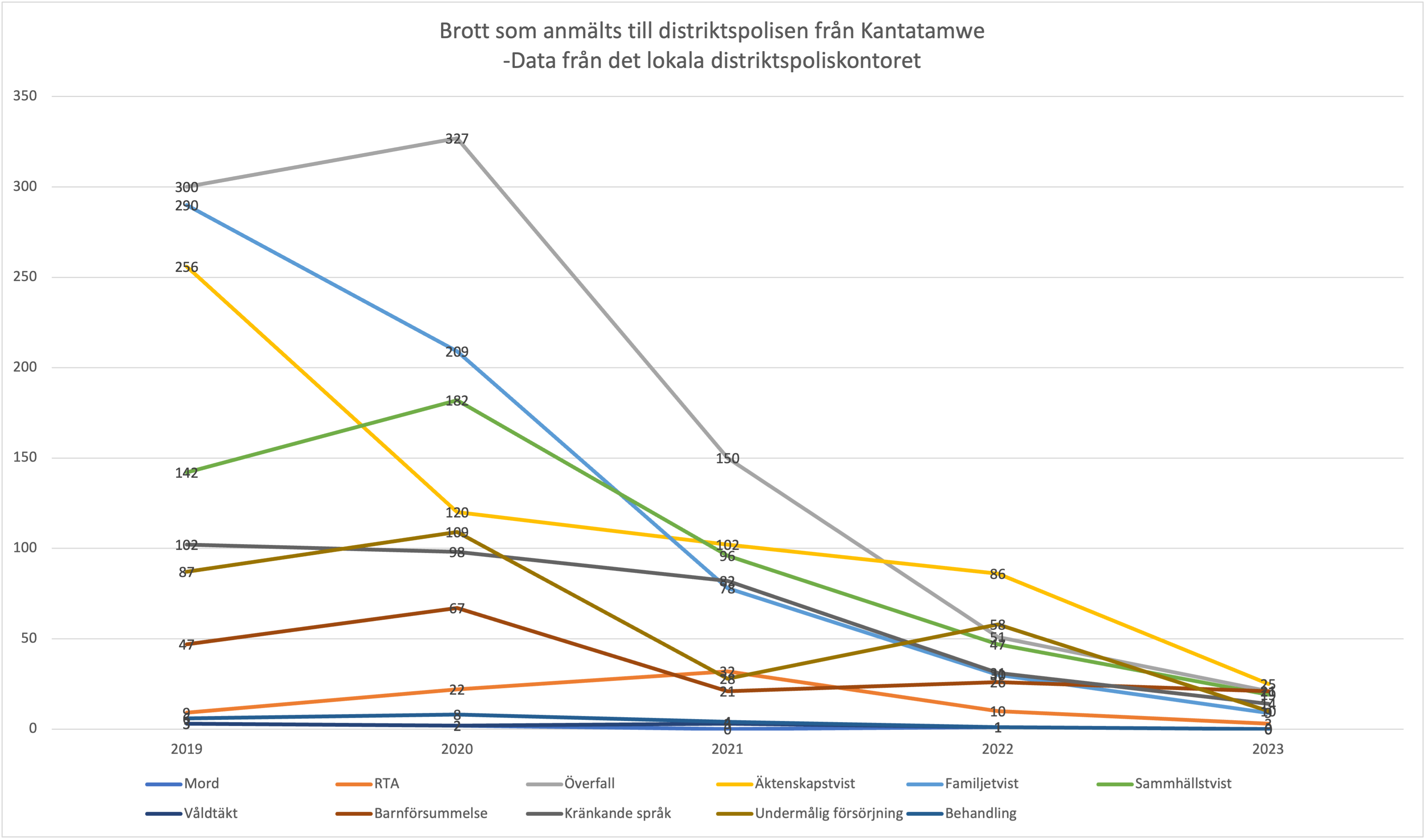 Antal brott som anmälts till polisen från området Kantatamwe sedan vi påbörjade vårt arbete 2019. Ord: Försummelse av barn, RTA=Road traffic accidents (trafikolyckor), konflikt i familjen, konflikt på allmän plats, sexuell kränkning.
